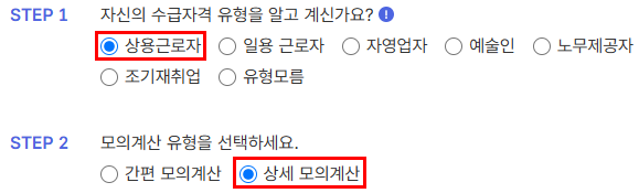 수급자격 유형을 선택하시고(보통을 상용근로자십니다), 모의계산유형을 상세모의계산으로 선택하세요. 생년월일과 고용보험 가입 기간을 입력하신 후, 퇴직 직전 3개월 동안 각 월의 평균임금을 입력해주세요. 오른쪽 하단의 계산 버튼을 누르시면 1일 구직급여일액을 확인할 수 있습니다.