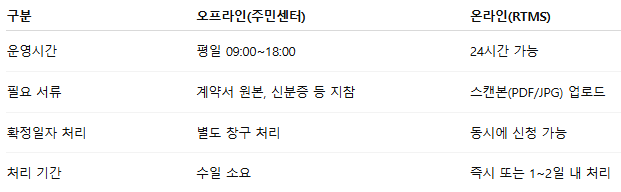 임대차 계약 신고는 읍·면·동 주민센터에서도 가능하지만, 온라인 신고는 다음과 같은 장점이 있습니다.