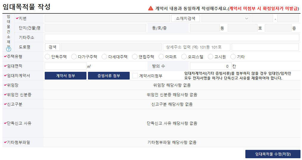 이 시스템을 통해 임대차계약 신고뿐만 아니라, 확정일자 부여, 임대차계약 변경신고, 계약 해지 신고까지 원스톱으로 처리할 수 있습니다.
