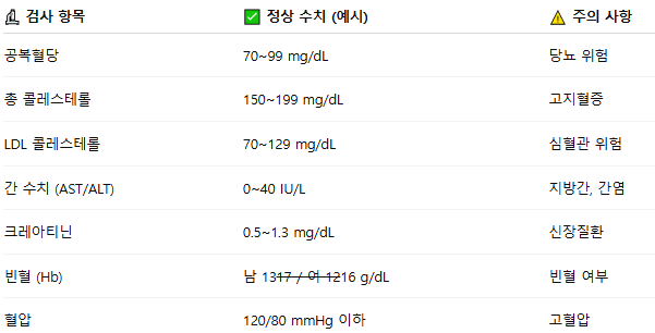- 기본 혈액 검사 (간기능, 신장기능, 혈당, 콜레스테롤 등) 🩸